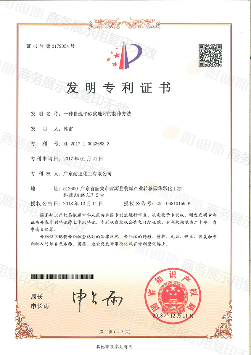 - 获得《自流平彩砂材料》发明专利